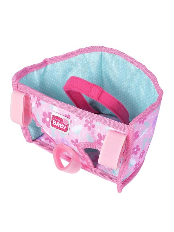 New Born Baby cykelsæde i tekstil med sikkerhedssele. Kan fastgøres på cykel eller løbehjul med velcrobåndene. Passer 30-43 cm dukker. Fra 3 år.
